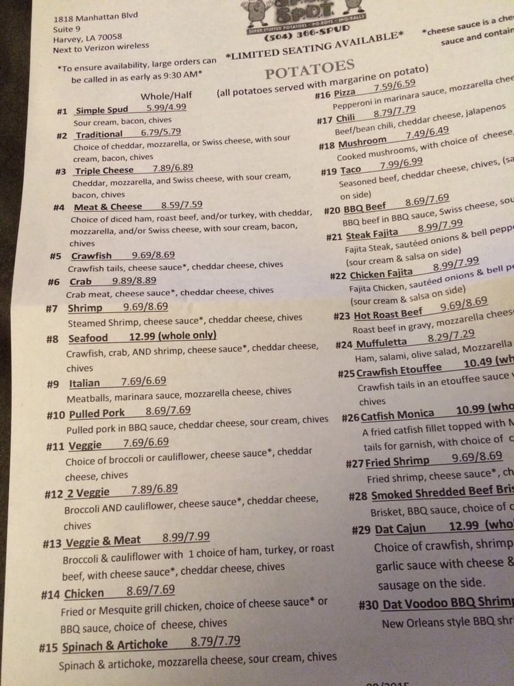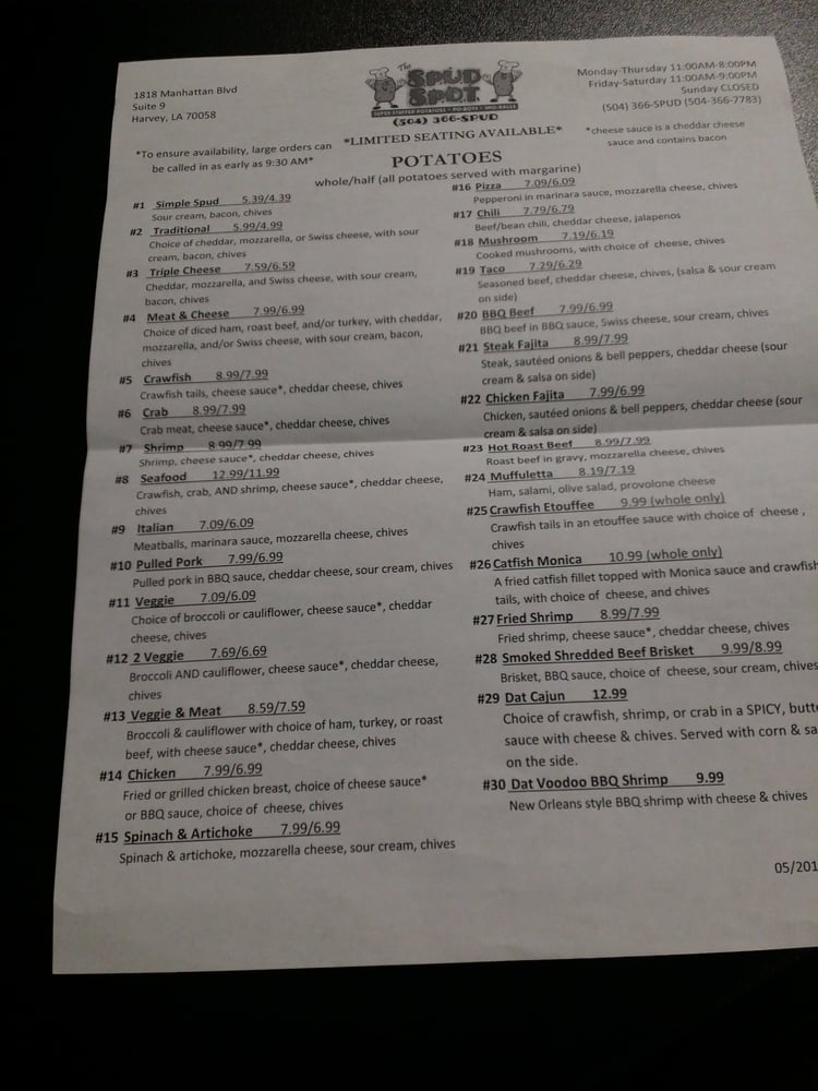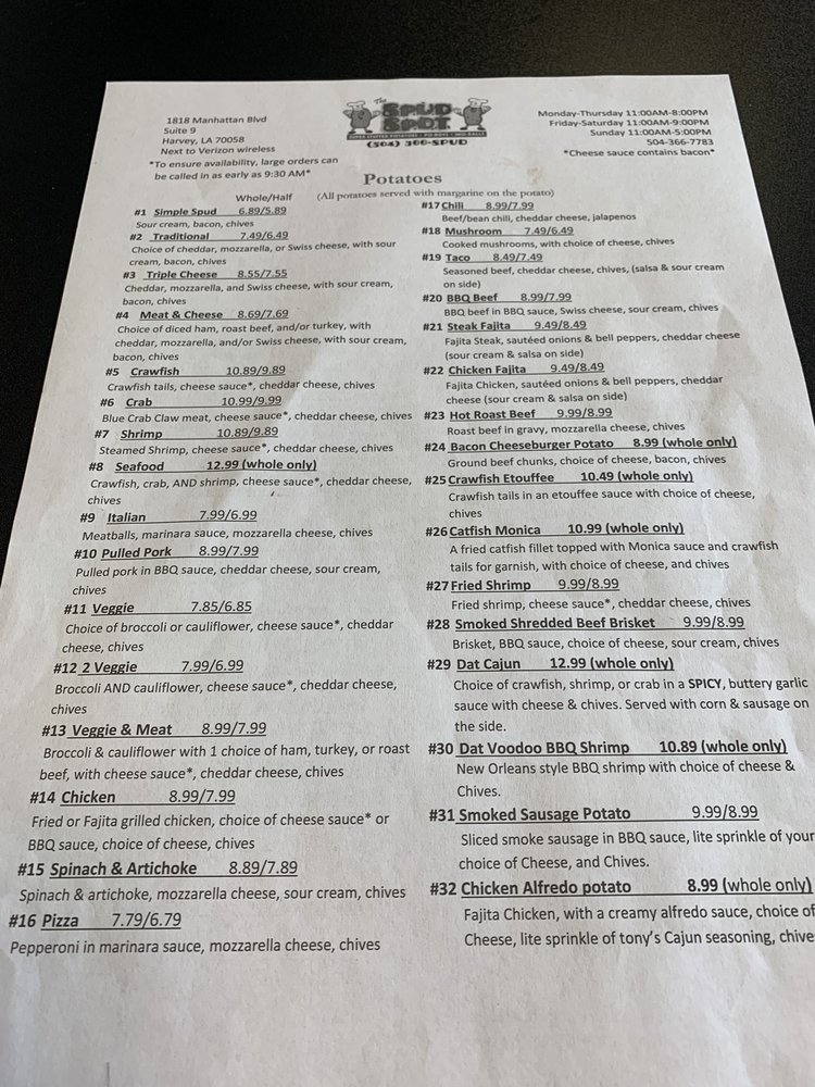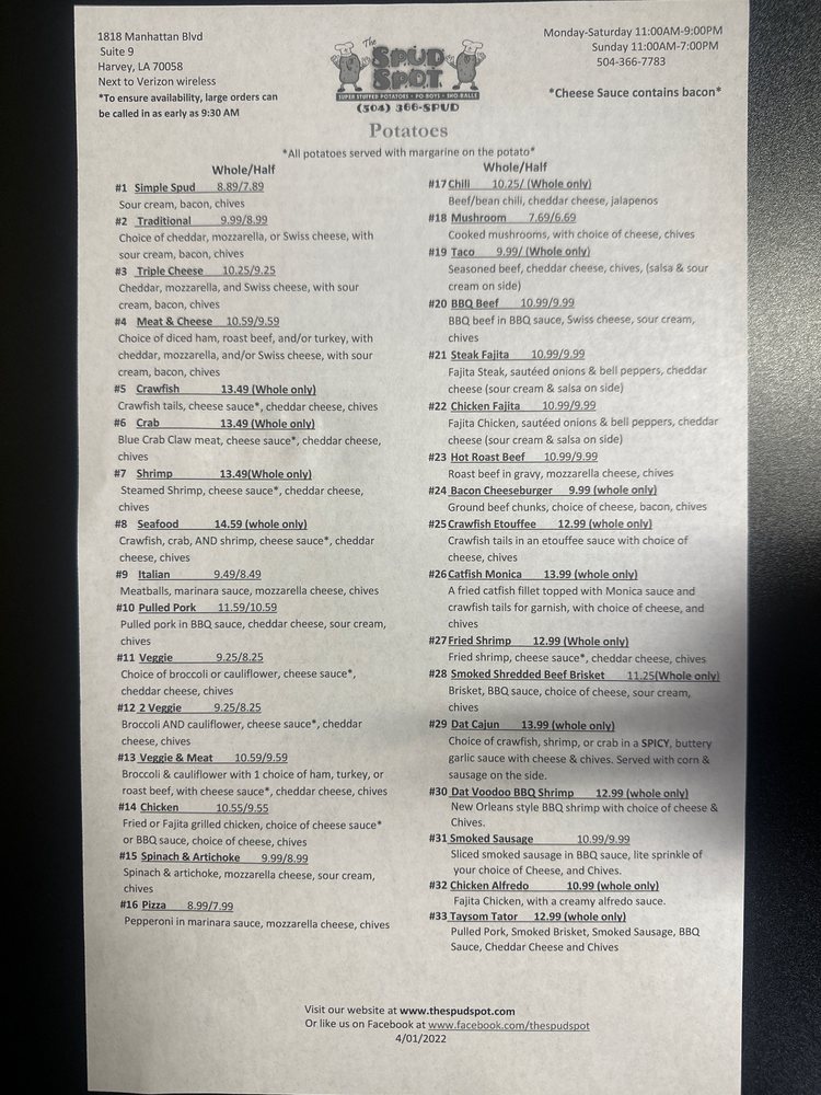 Introducing The Spud Spot, a unique dining experience specializing in stuffed baked potatoes and a variety of toppings. Located in Harvey, LA, this casual spot offers a wide range of options, from simple sour cream and bacon to elaborate seafood and meat combinations. The menu also includes salads, sides like fried pickles, and even a selection of desserts. Customers rave about the freshness and flavor of the potatoes, with standout options like the Seafood Potato and Chicken Alfredo Potato. The staff is friendly and accommodating, ensuring a pleasant dining experience. With numerous vegetarian options and a range of flavors to choose from, The Spud Spot is a must-try for potato lovers looking for a twist on a classic dish. So, step into this cozy spot and indulge in a loaded potato creation that will leave you satisfied and craving more.