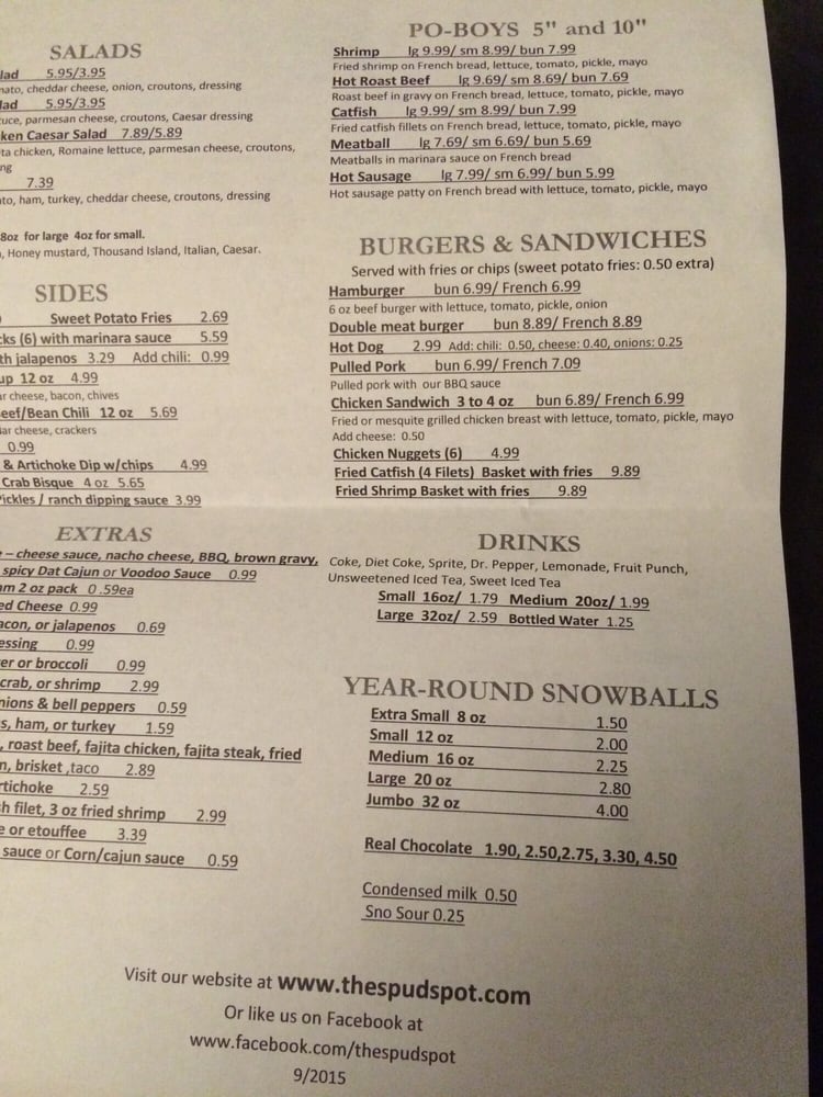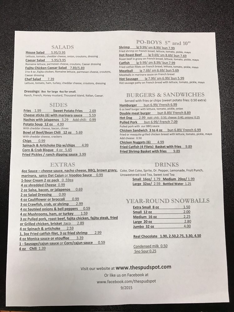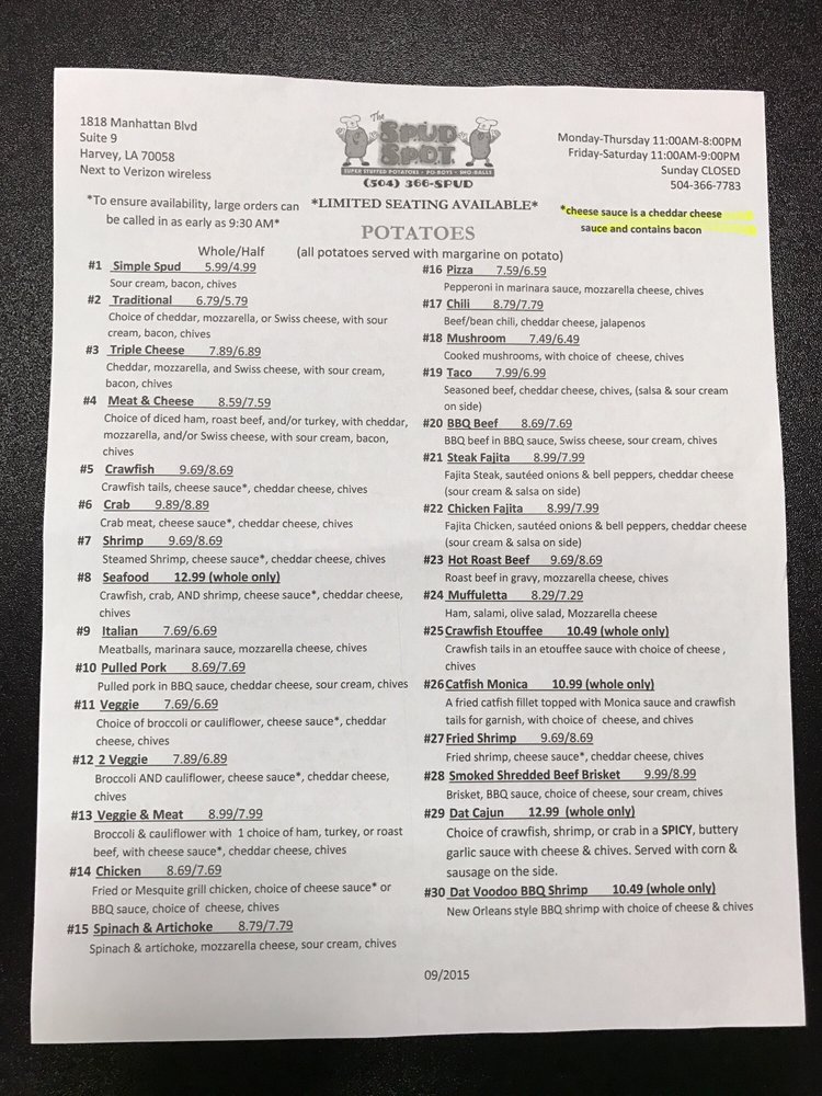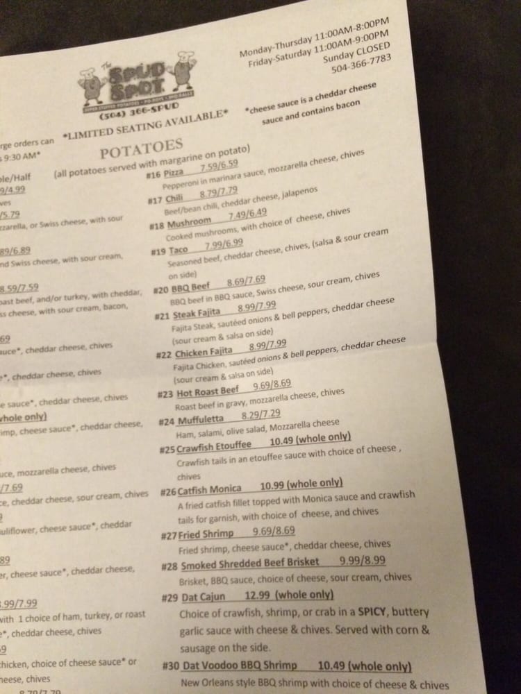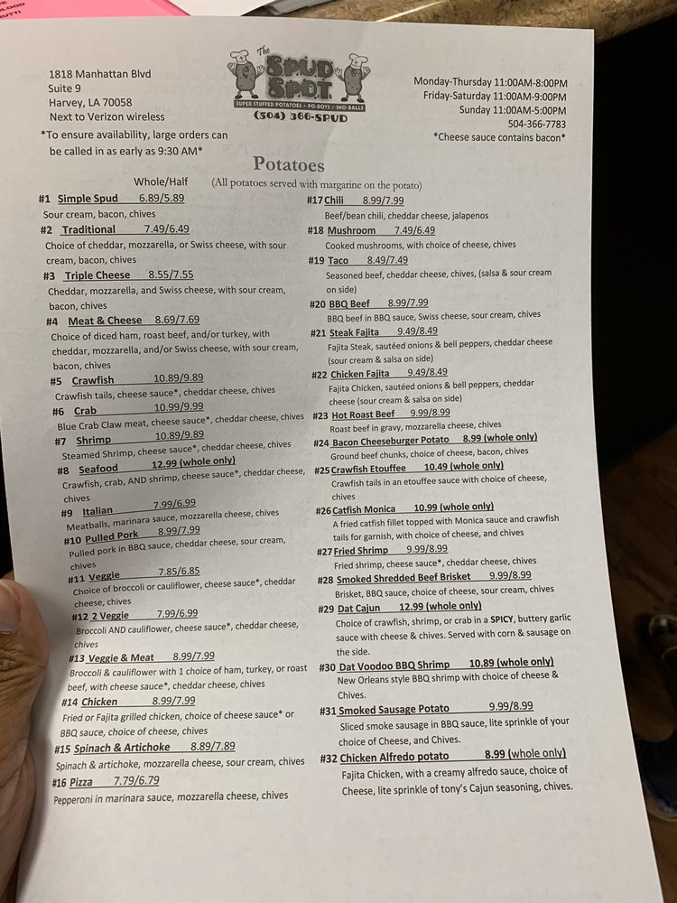 Introducing The Spud Spot, a unique dining experience specializing in stuffed baked potatoes and a variety of toppings. Located in Harvey, LA, this casual spot offers a wide range of options, from simple sour cream and bacon to elaborate seafood and meat combinations. The menu also includes salads, sides like fried pickles, and even a selection of desserts. Customers rave about the freshness and flavor of the potatoes, with standout options like the Seafood Potato and Chicken Alfredo Potato. The staff is friendly and accommodating, ensuring a pleasant dining experience. With numerous vegetarian options and a range of flavors to choose from, The Spud Spot is a must-try for potato lovers looking for a twist on a classic dish. So, step into this cozy spot and indulge in a loaded potato creation that will leave you satisfied and craving more.